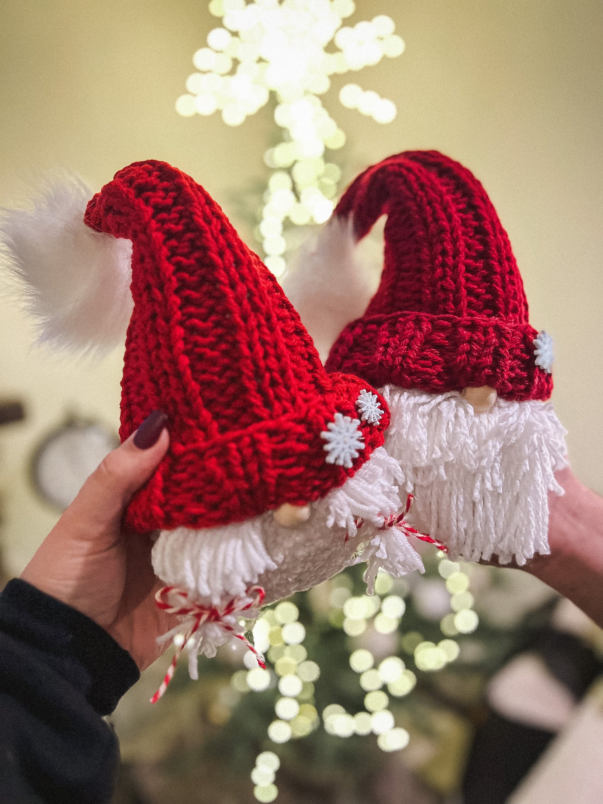 Say hello to our Mini Santa Gnome Set! They are sewn from a super soft Sherpa/teddy cream colored material, a beard and braids made of yarn, a wooden nose, and a knitted red (not super bright, more burgundy) hat that has the cutest white faux fur pom pom at the end. They are the perfect addition to your decor and he can't wait to meet you!