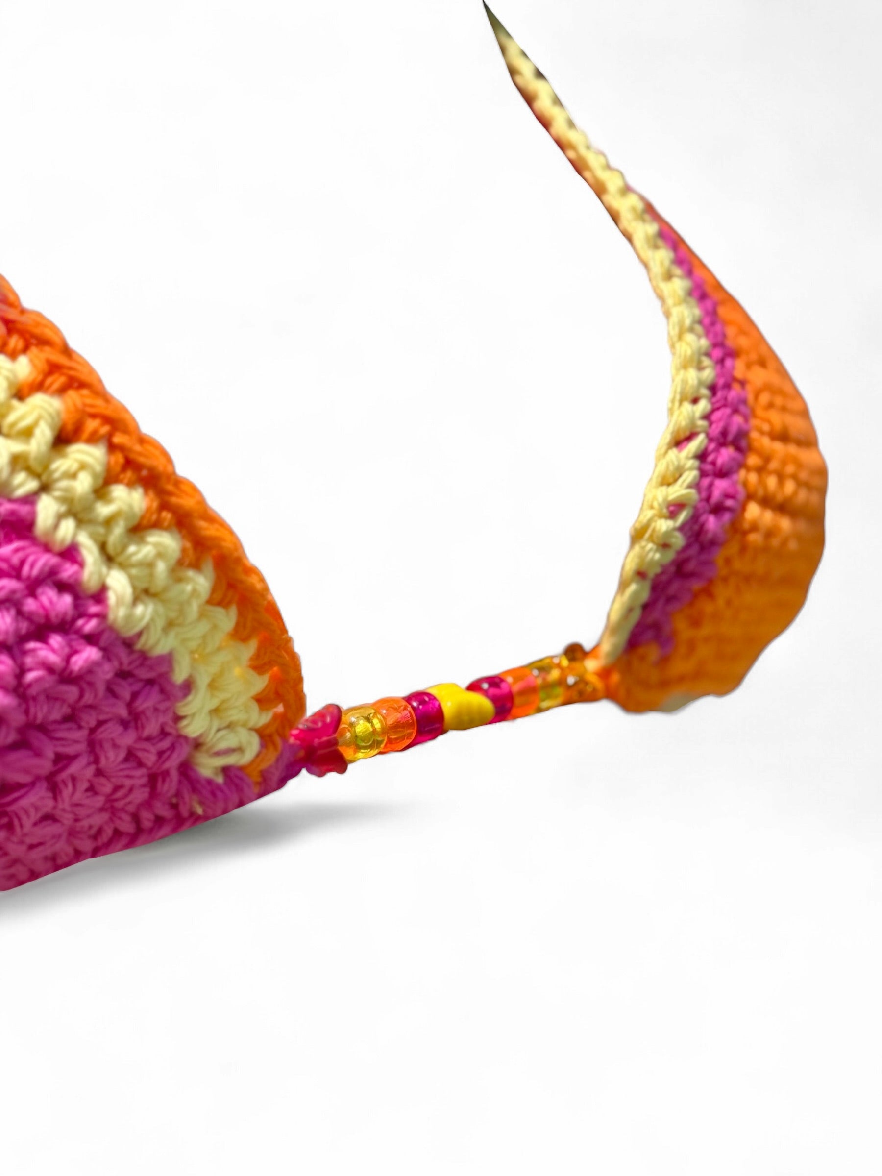 Get ready to shine this summer with our Sunset Bliss Crochet Bikini Top! Handcrafted with love and made to stand out, this vibrant, multicolored bikini top features a stunning combination of orange, pink, and yellow, perfectly capturing the warmth and beauty of a summer sunset. Designed with comfort and style in mind, it’s perfect for days at the beach, poolside lounging, or any sunny getaway. The adjustable straps and beaded detailing add a playful and fun touch to your look. Let the Sunset Bliss Crochet Bikini Top be your go-to for bringing a pop of color and a burst of happiness to your summer wardrobe!